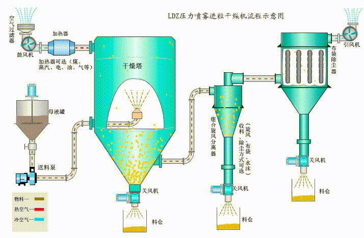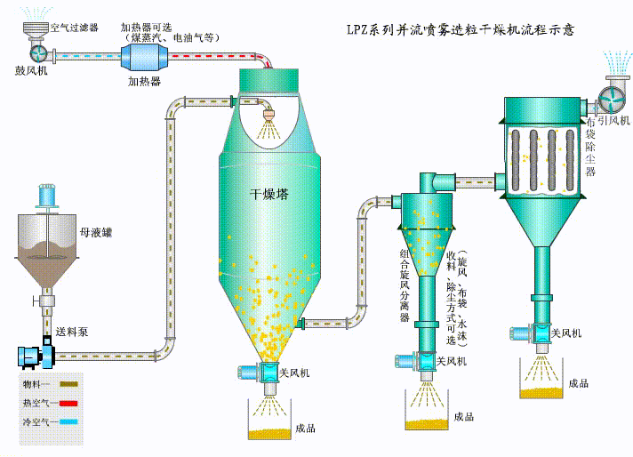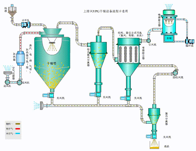 經過一段時間的運轉,我們需對噴霧造粒干燥機進行必要的檢查與養護。對于供料系統,應檢查過濾器、管道、閥門、噴嘴等,看有無堵塞,定時清洗,檢查噴嘴磨損情況以便及時替換。應檢查料泵是否漏油,打壓是否正常,油位是否正常等。對于風機,應查看軸和軸承是否缺油發熱,有無震動、噪音等,必要時清洗風葉和對風葉做平衡校對。對于加熱器,應檢查熱管是否正常,必要時清洗油管、油泵、油嘴三處的過濾網。另外,還應留意各電動機有無發熱、振動、異聲等情況,控制柜的儀表和電器工作是否正常等。